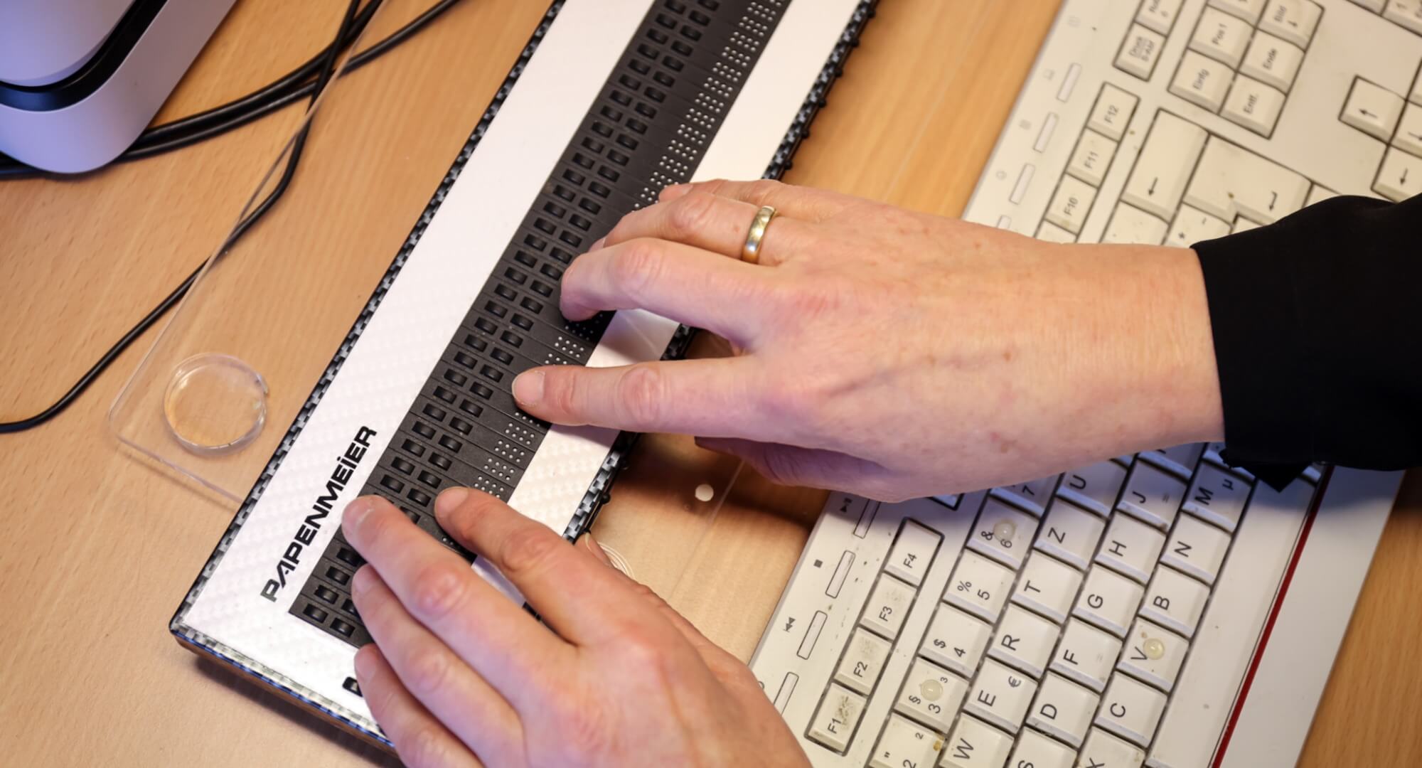 Ihre Assistenz sei dabei „der Nachteilsausgleich, um den fehlenden Sinn Sehen auszugleichen“, so Frau Dr. Bungart. Zusätzlich erleichtern viele technische Hilfsmittel das Arbeitsleben und machen das digitale Arbeiten erst möglich. Diese Kombination macht ihr Arbeiten barrierefrei.