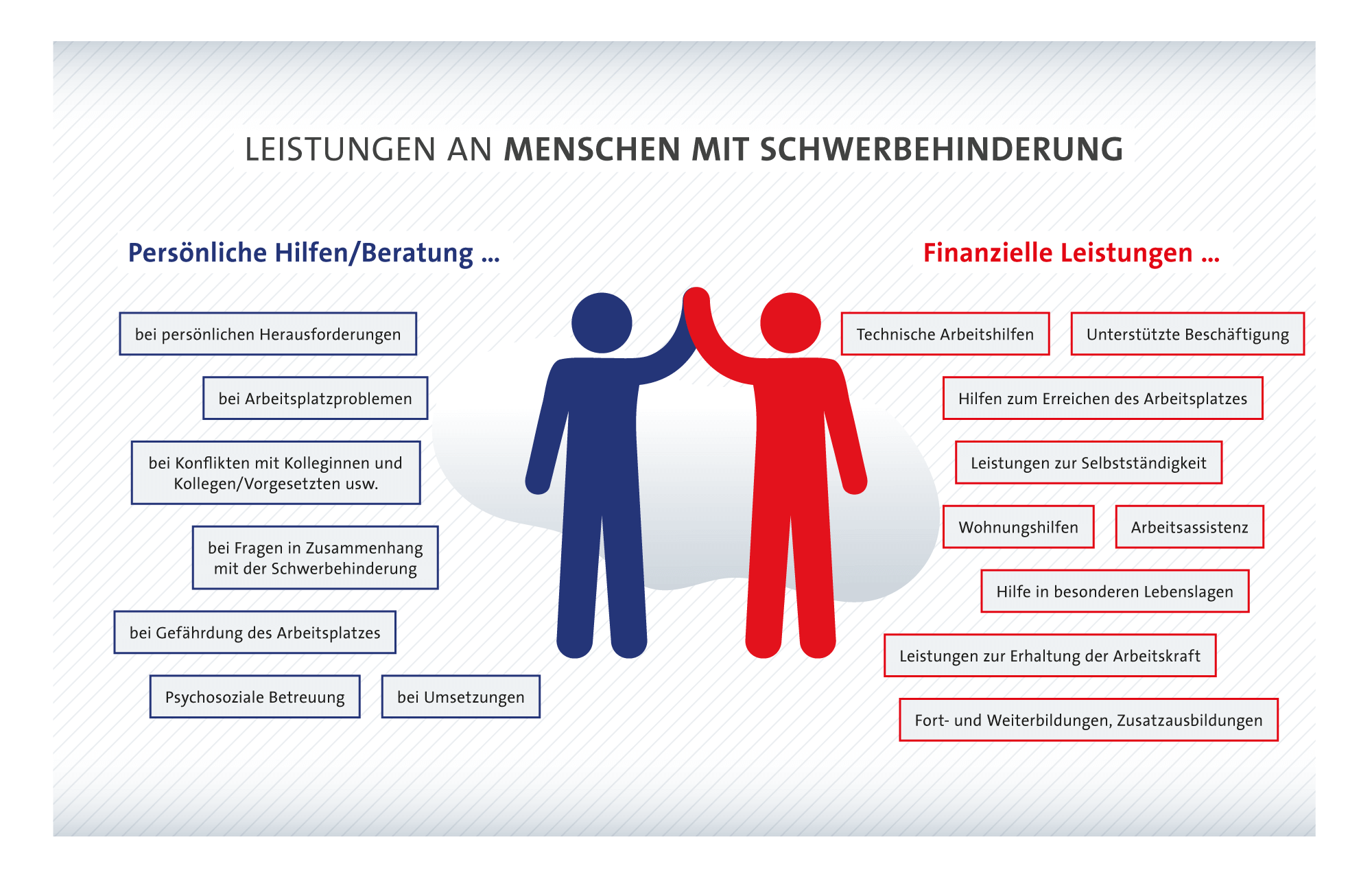 Aber was bedeutet das konkret? Die Begleitende Hilfe im Arbeitsleben umfasst finanzielle Leistungen an Arbeitgeber und Menschen mit Behinderungen, fachliche Beratung und die psychosoziale Betreuung schwerbehinderter Menschen durch Integrationsfachdienste. Das Integrationsamt soll außerdem darauf Einfluss nehmen, dass Schwierigkeiten bei der Beschäftigung verhindert oder beseitigt werden.
